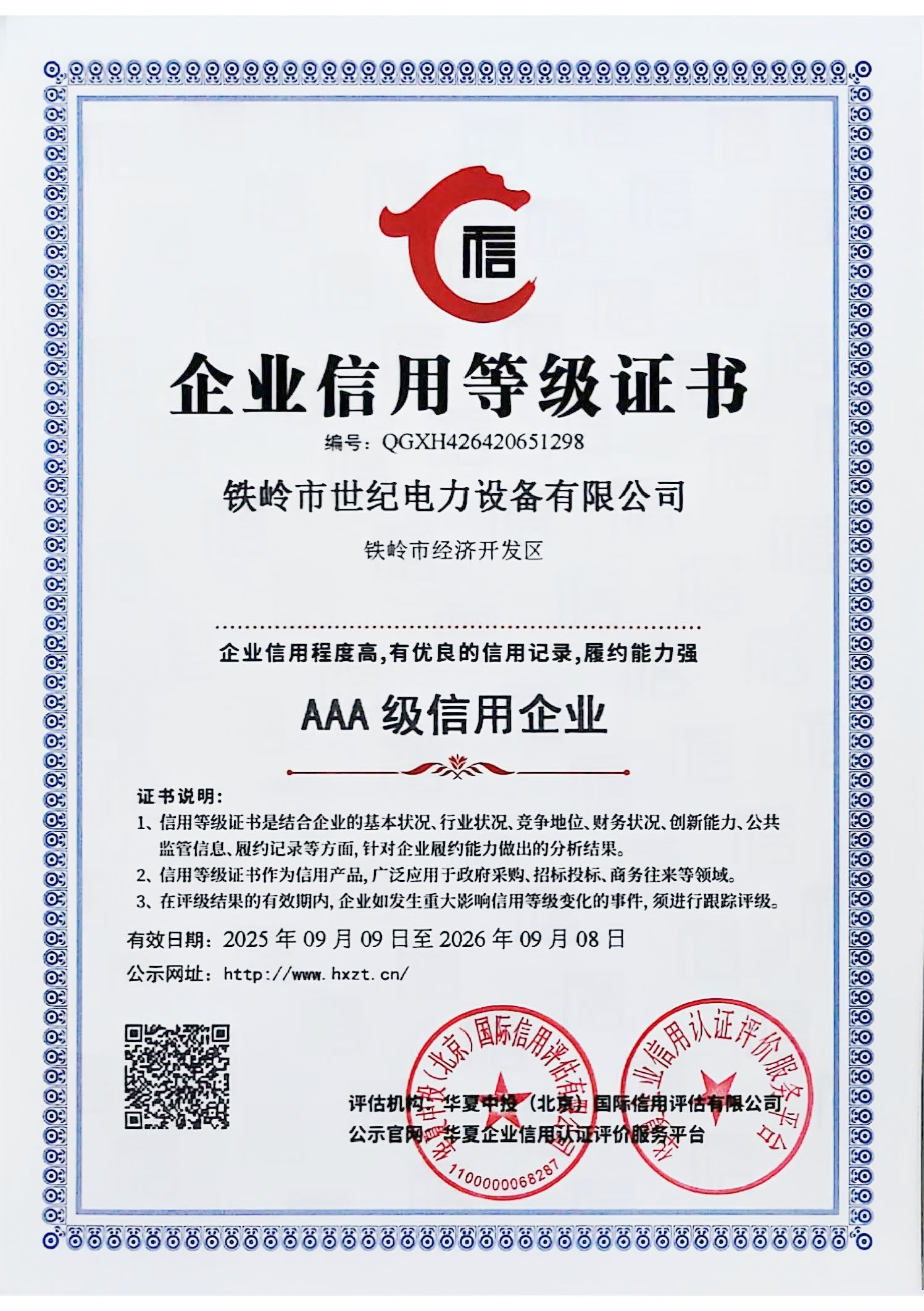 世紀(jì)電力AAA級信用證書